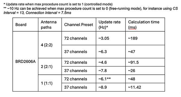 下表顯示了更新速率以及距離估算算法(SiSDK中的24Q4-GA)的執(zhí)行時間,這些數(shù)據(jù)是所使用天線數(shù)量的函數(shù)。我們還改變了信道間隔設(shè)置,使其在1 MHz間隔(72個信道)和2 MHz間隔(37個信道)之間變化,以便展示除了天線數(shù)量之外,其他因素是如何對更新速率和處理時間產(chǎn)生顯著影響的。