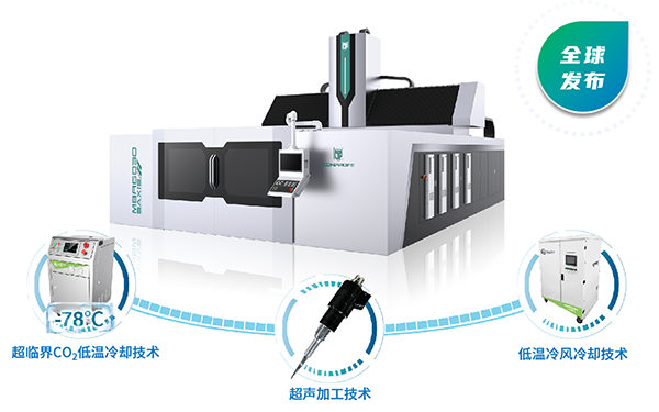 匯專超聲綠色復材龍門五軸聯(lián)動加工中心創(chuàng)新性地搭載了“智能化雙超聲綠色系統(tǒng)”,實現(xiàn)了超聲、低溫冷風、超臨界二氧化碳三種技術的靈活組合應用。超聲切割銑削最高轉速達到24000r/min,最大超聲振幅50μm,環(huán)噴低溫冷卻最低溫度可達-78℃。同時,可在同一個主軸通過自動換刀,實現(xiàn)匕首刀、圓片刀、破碎組合刀、銑刀等不同刀具的自動切換。加工中心還配置了匯專自主研發(fā)的智能閉環(huán)控制系統(tǒng),使超聲加工持續(xù)保持穩(wěn)定狀態(tài)。