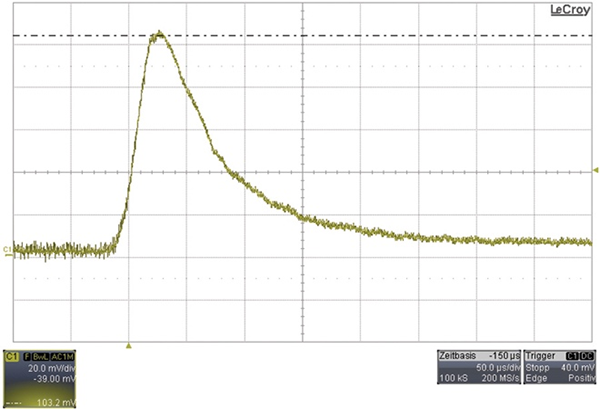 圖3顯示了在負(fù)載瞬態(tài)響應(yīng)期間交流耦合輸出電壓中的電壓尖峰,其測(cè)量設(shè)置如圖1所示。峰值電壓約為103 mV。相比之下,圖4顯示了連接線的導(dǎo)線整齊絞合在一起(如圖2所示)時(shí)的測(cè)量結(jié)果。此時(shí),輸出電壓中的電壓尖峰只有大約96 mV。這相當(dāng)于大約7 mV的差異,它表明連接線的整齊排列可導(dǎo)致該負(fù)載瞬態(tài)測(cè)試結(jié)果改善大約7%。