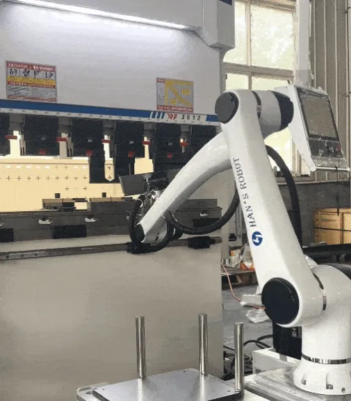 折彎是鈑金加工中心最常見的工序之一,傳統(tǒng)產(chǎn)線上“折彎機+工人”的加工模式,工人淪為機械設(shè)備的“附庸”,從事高重復(fù)度、低附加值的工作。華沿E10L協(xié)作機器人經(jīng)過簡單示教后,可與折彎機協(xié)同作業(yè),實現(xiàn)待加工鈑金取、放、折彎工序完全自動化。