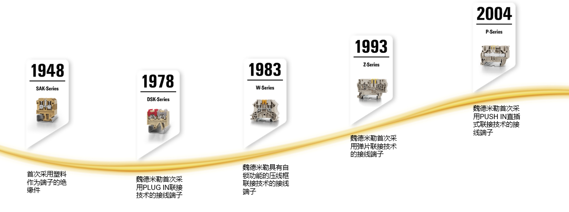 · 1960 年,魏德米勒注冊了一款采用單線螺釘聯(lián)接的端子排,可直接安裝到PCB(印刷電路板上),從此OMNIMATE® 聯(lián)接技術開啟 60 余年 “超長待機” 迭代。