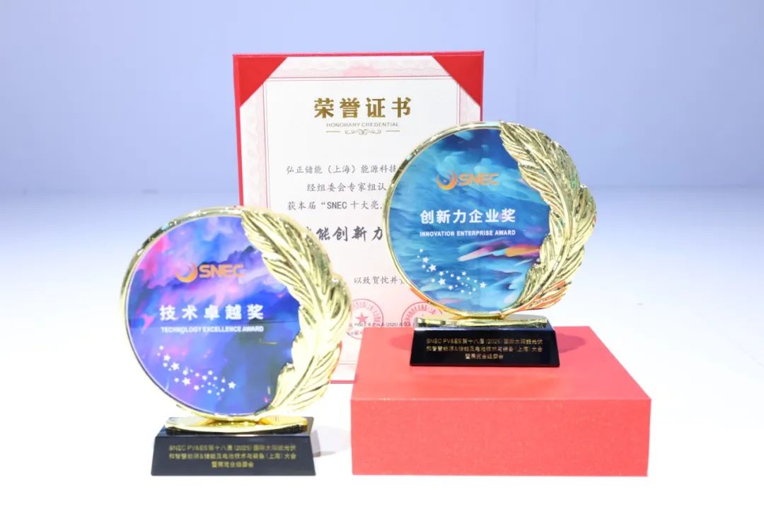 作為新能源領(lǐng)域的年度盛會,SNEC PV+不僅是企業(yè)展示實力的舞臺,更是行業(yè)認可的重要窗口。在同期舉辦的“十大亮點評選與發(fā)布”活動中,弘正儲能憑借深厚的數(shù)字化技術(shù)積淀與卓越創(chuàng)新能力,從眾多優(yōu)秀品牌中脫穎而出,一舉斬獲“儲能卓越技術(shù)獎”與“儲能創(chuàng)新力企業(yè)獎”雙料榮譽。這一榮譽不僅是對弘正儲能綜合實力的權(quán)威認可,更傳遞了行業(yè)對其未來發(fā)展前景的堅定信心與高度期待。