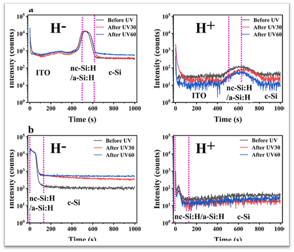 長(zhǎng)期以來,紫外線對(duì)n型高效電池的侵蝕如同“隱形殺手”——365nm波長(zhǎng)的紫外光子會(huì)精準(zhǔn)破壞硅氫鍵(Si-H),導(dǎo)致界面鈍化失效。作為鈍化效果最好,效率更優(yōu)的異質(zhì)結(jié)電池,也不例外。在這次的研究中,團(tuán)隊(duì)通過二次離子質(zhì)譜(SIMS) 首次捕捉到氫原子遷移軌跡(圖2)。