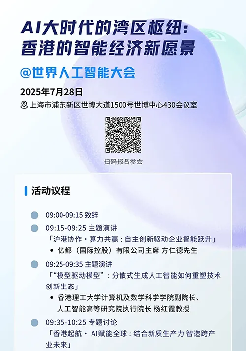 其中,“AI大時代的灣區(qū)樞紐:香港的智能經(jīng)濟新愿景”論壇將于7月28日上午在上海世博中心舉行,邀請香港與內地人工智能領域知名專家、學者、企業(yè)家共同探討人工智能如何重塑科技創(chuàng)新生態(tài)、香港在全球創(chuàng)科合作中的角色等議題。