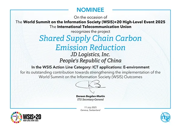 近日,在瑞士日內(nèi)瓦舉辦的“2025年信息社會(huì)世界峰會(huì)(WSIS)頒獎(jiǎng)盛典”上,京東物流憑借“基于MRV-T技術(shù)的供應(yīng)鏈上下游協(xié)同降碳”項(xiàng)目(英文名稱:Shared Supply Chain Carbon Emission Reduction Based MRV-T Technology),從全球近千個(gè)候選項(xiàng)目中脫穎而出,成功進(jìn)入“AL C7. 惠及生活方方面面——電子環(huán)境”賽道前20名,榮獲WSIS Prizes 2025提名獎(jiǎng)。值得關(guān)注的是,京東物流也是今年唯一獲獎(jiǎng)的物流企業(yè),彰顯了其在技術(shù)驅(qū)動(dòng)和創(chuàng)新融合領(lǐng)域的全球領(lǐng)先地位。