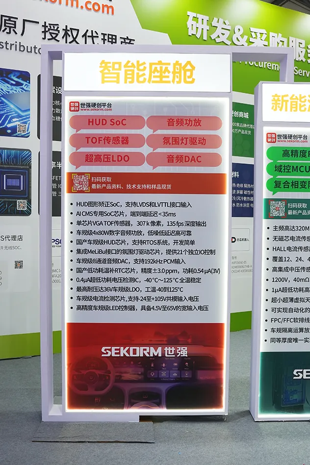 作為深耕電子產(chǎn)業(yè)技術(shù)服務(wù)30年的生態(tài)平臺(tái),世強(qiáng)硬創(chuàng)攜千家核心原廠資源,在N3館精彩亮相。展會(huì)涵蓋10大專區(qū),包括智能駕駛、新能源與三電系統(tǒng)、車身控制域、智能座艙、高效能48V系統(tǒng)、EV新材料、車規(guī)IC、車用功率器件、車規(guī)傳感器及機(jī)器人等領(lǐng)域,完整展示了世強(qiáng)硬創(chuàng)平臺(tái)代理的芯科科技、智芯科技、Littelfuse(力特)、藍(lán)海光電、Melexis(邁來芯)、圣邦微電子、地瓜機(jī)器人、京瓷、EPC、中微半導(dǎo)體(CMSemicon)、杰華特微電子、大普通信、EPSON(愛普生)等品牌在汽車電子行業(yè)的最新產(chǎn)品和技術(shù)。
