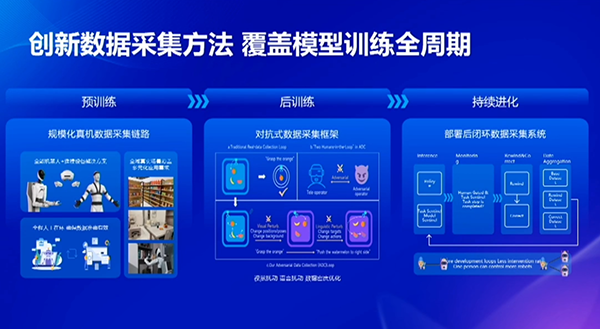 擁有如此大規(guī)模、高質(zhì)量的預(yù)訓(xùn)練數(shù)據(jù)集,是由于智元機(jī)器人在數(shù)據(jù)采全生命周期上的創(chuàng)新。其引入了后訓(xùn)練數(shù)據(jù)集以及自主進(jìn)化式的數(shù)據(jù)采集的方式。在后訓(xùn)練階段,對(duì)抗式采集是在常規(guī)的示教操作過程中引入干擾。姚卯青生動(dòng)地將其比喻為:“讓工作人員‘搗亂’,使機(jī)器人在相同采集時(shí)間內(nèi)訪問到更多物理狀態(tài)和語(yǔ)言指令(如中途改變指令)。”這種方式取得了極好的效果:大幅提升了數(shù)據(jù)的信息密度,使得模型迭代和收斂速度提高數(shù)倍。