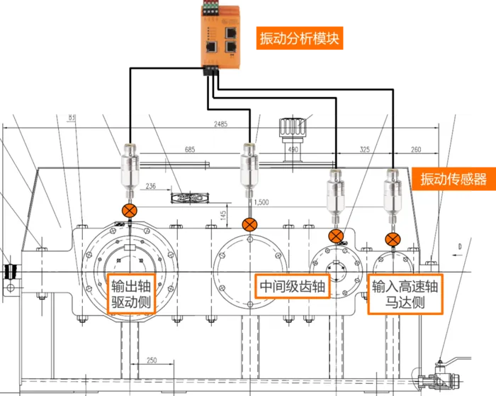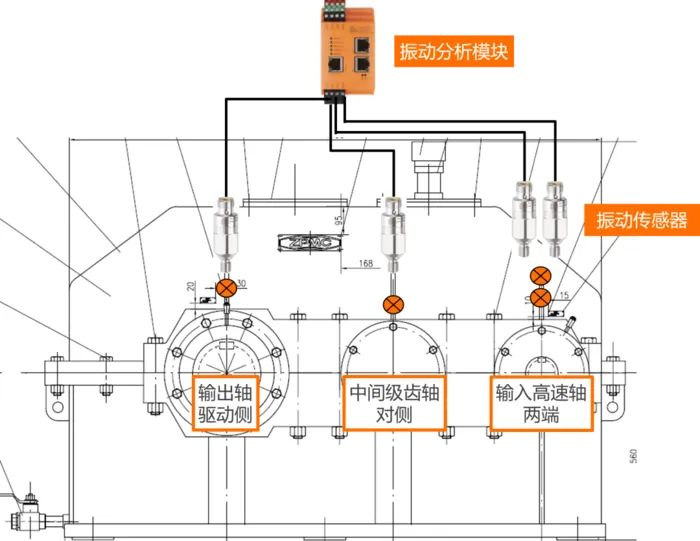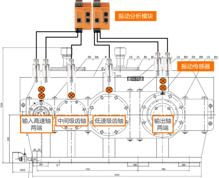 注:圖中所示減速箱監(jiān)測(cè)點(diǎn),需配合驅(qū)動(dòng)電機(jī)兩端、鋼繩卷筒軸承座等,構(gòu)成完整監(jiān)測(cè)鏈。