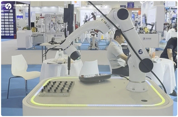 作為展區(qū)亮點(diǎn)之一,華沿機(jī)器人一體式螺絲擰緊工作站展示了協(xié)作機(jī)器人在大扭矩、高精度螺絲鎖付場(chǎng)景下的卓越性能。華沿機(jī)器人臂形獨(dú)特,它采用獨(dú)特的雙關(guān)節(jié)模組結(jié)構(gòu)設(shè)計(jì),實(shí)現(xiàn)2000mm超長(zhǎng)臂展、60KG超大負(fù)載,滿足300N·m大扭矩?cái)Q緊需求,可靈活適配多種擰緊工具與復(fù)雜應(yīng)用場(chǎng)景,精準(zhǔn)、穩(wěn)定地完成螺絲取、放、擰緊等工序。