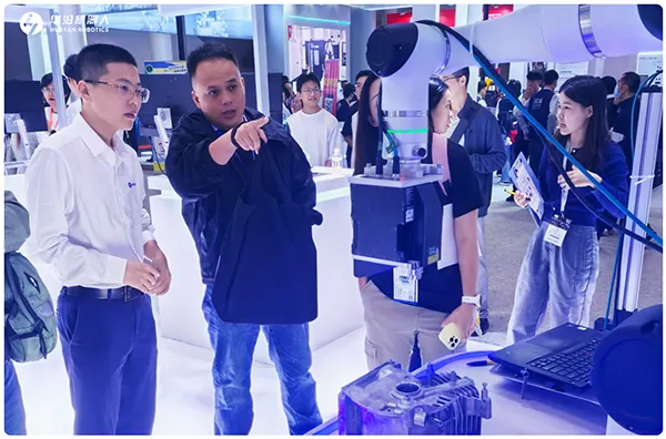 在展會現(xiàn)場,華沿機(jī)器人與基恩士共同展示“機(jī)械手柔性3D測量”方案在汽車發(fā)動(dòng)機(jī)零部件檢測領(lǐng)域的高效應(yīng)用。華沿協(xié)作機(jī)器人搭載基恩士基于最新采用飛掃激光技術(shù)打造的全自動(dòng)掃描3D視覺系統(tǒng)(LJ-S8000系列)對工件進(jìn)行3D掃描,快速獲取外觀、尺寸、形狀與位置等數(shù)據(jù),助力檢測等工序自動(dòng)化、柔性化?;魇抗こ處煴硎荆谌A沿協(xié)作機(jī)器人進(jìn)行3D掃描檢測,“更加靈活方便,更加適合小批量、多品種生產(chǎn)場景”。