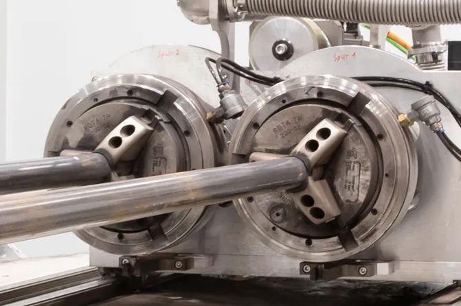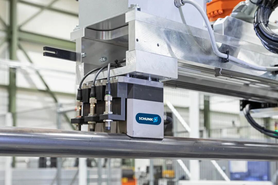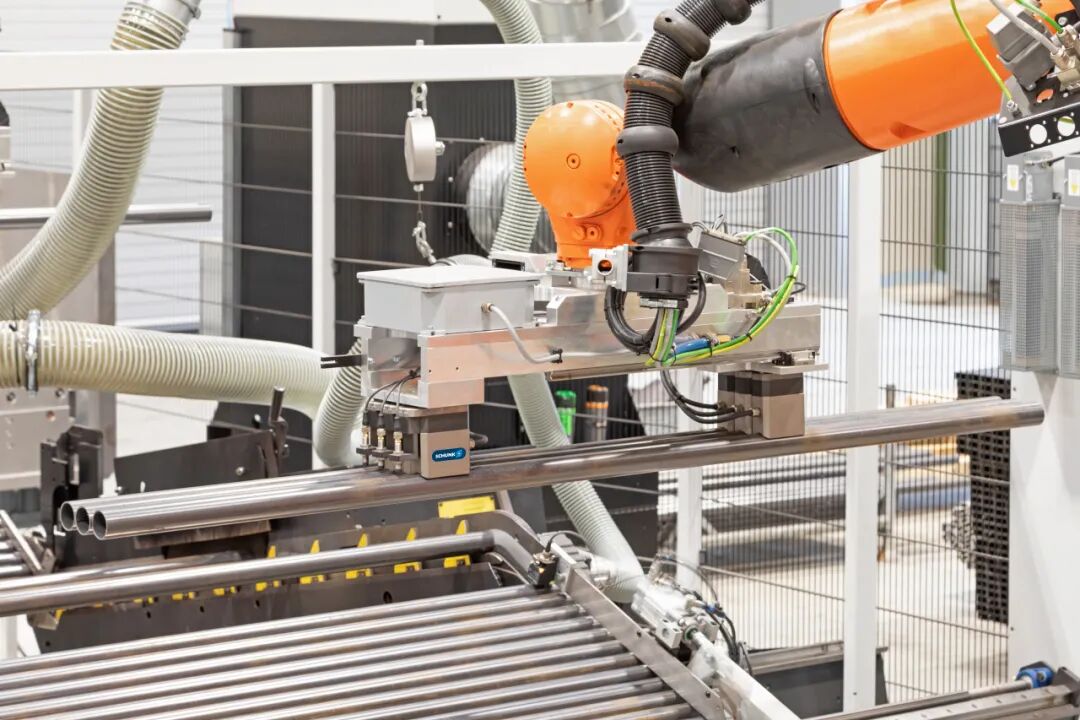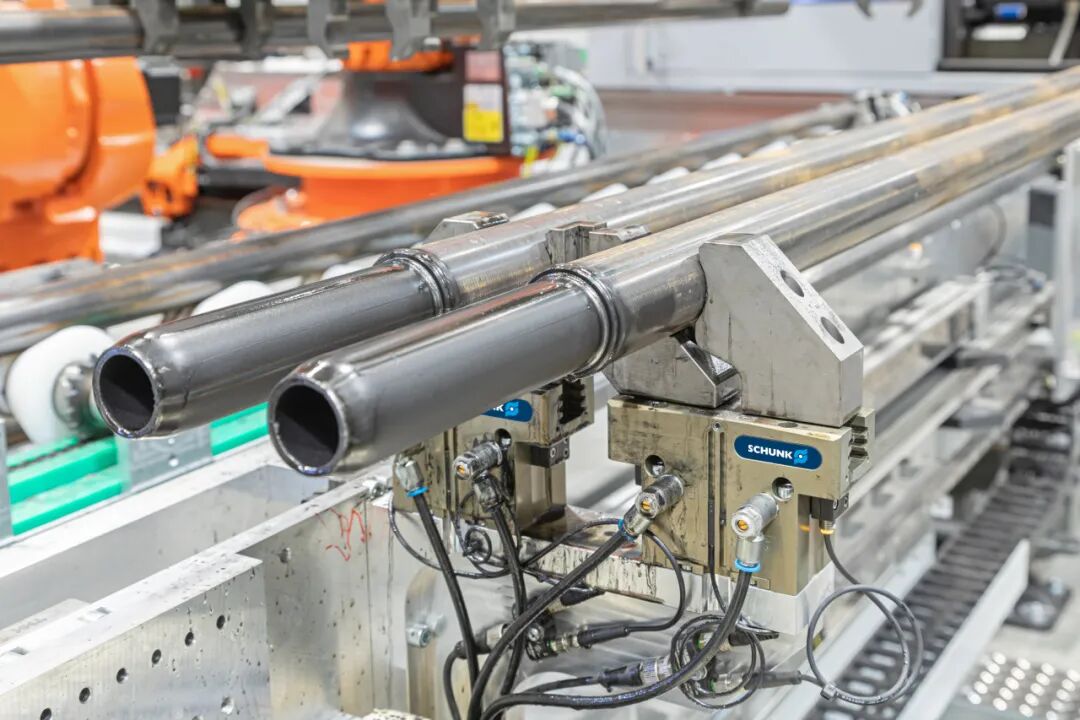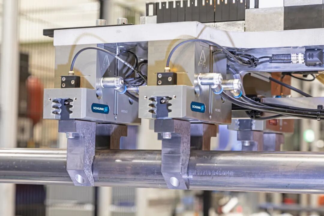 由兩個機器人(均配備多個 PGN-plus-P 機械手)轉(zhuǎn)運到裝有SCHUNK ROTA TP 200三爪卡盤的推動裝置上。推動裝置移動到激光切割單元中。