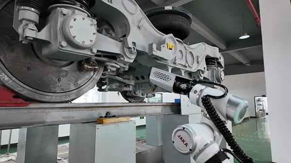 景曜科技與節(jié)卡機器人的合作,同是一場技術(shù)協(xié)同創(chuàng)新:景曜的3D 機器視覺 + 復合機器人平臺,可精準識別列車底部、側(cè)部的螺栓松動、管線異常等細微缺陷;節(jié)卡的協(xié)作機械臂作為“靈活手”,可根據(jù)視覺指令,精準抵達檢測點位,完成近距離觀測、數(shù)據(jù)采集動作,讓軌道交通巡檢既能看得見(識別缺陷),又能做得到(精準檢測)。
