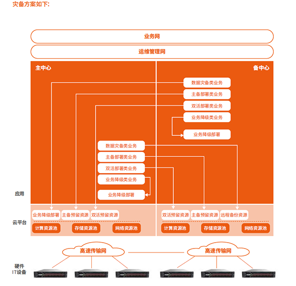 主備中心部署雙保險(xiǎn)策略。一是通過犧牲一半服務(wù)能力,在主備中心部署相同業(yè)務(wù)應(yīng)用。哪怕主中心突然罷工,備中心也能立刻“接棒”,保障業(yè)務(wù)系統(tǒng)正常運(yùn)行;二是主備中心部署同一業(yè)務(wù)的不同應(yīng)用,互相預(yù)留災(zāi)備資源,提升業(yè)務(wù)韌性。