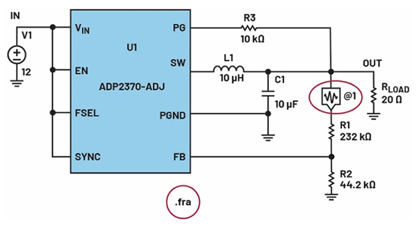 第一步,使用LTspice打開電源電路,例如一個開關穩(wěn)壓器電路。圖1顯示了ADP2370降壓型開關穩(wěn)壓器的電路。在LTspice中,測試電路(也就是外部電路)可以從現成的電路中選擇。當電路出現在顯示屏上后,從“組件”選項卡中選擇一個頻率響應分析儀(FRA)。它將添加至上分壓電阻(R1)的上方。圖1顯示了本例中所使用的FRA。