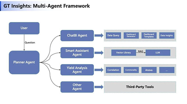GT Insights的價(jià)值不止于單點(diǎn)能力的突破,更在于其作為格創(chuàng)東智CIM AI Foundation的重要組成部分,與它基于格創(chuàng)東智的Octopus AI Agent平臺(tái)3.0開(kāi)發(fā),可通過(guò)AI Agent框架,與Planner Agent、Yield Analysis Agent等智能體“數(shù)字員工”協(xié)同工作。從被動(dòng)響應(yīng)走向主動(dòng)規(guī)劃分析路徑、調(diào)用第三方工具(如SPC軟件、良率分析插件),形成閉環(huán)的分析決策能力。