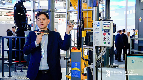 齒條升降機(jī)以創(chuàng)新設(shè)計(jì)重新定義塔筒登高安全,成為3S展臺備受矚目的“明星”產(chǎn)品。齒條升降機(jī)以齒條導(dǎo)向取代傳統(tǒng)鋼絲繩導(dǎo)向,以滑觸供電系統(tǒng)替代傳統(tǒng)隨行電纜,實(shí)現(xiàn)運(yùn)行過程更安全、更穩(wěn)定、更高效。同時,設(shè)備支持吊裝期隨吊隨用,顯著提升施工效率,徹底解決了吊裝階段無登高設(shè)備可用的行業(yè)痛點(diǎn)。