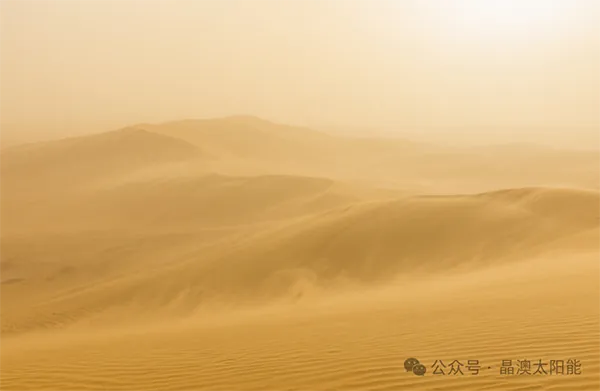 在沙戈荒環(huán)境中,沙塵砂石是重要的環(huán)境組成部分,伴隨強(qiáng)風(fēng),沙塵砂石隨風(fēng)而起,將對組件造成物理磨損,長此以往,不僅會影響組件的機(jī)械強(qiáng)度,更將拉低組件透光率,導(dǎo)致發(fā)電性能下降。