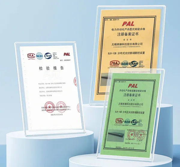 英臻的SLR-10B分布式光伏群調(diào)群控裝置已成功通過國家自動化產(chǎn)品電磁兼容檢驗、電力自動化產(chǎn)品型式檢驗、國家輸配電安全控制設(shè)備質(zhì)量檢驗檢測中心和國網(wǎng)電科院實驗驗證中心的聯(lián)合型式檢驗等認證,獲得國家電網(wǎng)注冊備案證書,為電站的長期穩(wěn)定運行提供可靠保障。