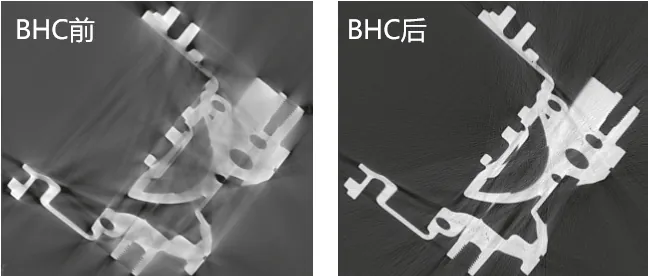 軟件中可以實(shí)現(xiàn)多種后處理操作,對掃描結(jié)果進(jìn)行優(yōu)化和改善,幫助我們獲得比較完美的掃描數(shù)據(jù)。比如在下圖中展示的復(fù)合材料偽影抑制效果(上)和射束硬化修正的效果(下)。
