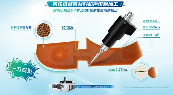 例如,使用匯專超聲綠色橋式龍門五軸聯(lián)動加工中心,搭配超聲加工技術(shù)、低溫冷風冷卻技術(shù),以及超聲切割匕首刀和圓片刀加工芳綸紙蜂窩飛機復(fù)材特征提取綜合件時,成功實現(xiàn)小角度及3D復(fù)雜輪廓高效加工,圓弧位置一刀切割成型,弧長552mm,切割夾角<18°,最薄處0.75mm, 加工時間從120分鐘縮短至57分鐘,縮短52.5%;目視無明顯毛刺,切削粉塵大幅減少,且有效降低了切削力,工件接觸面受力均勻,降低了材料損傷,工件表面平整無塌陷。