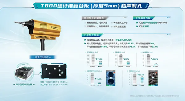 而在飛機裝配制孔環(huán)節(jié),匯專超聲鉆同樣發(fā)揮高效制孔的卓越效能。使用超聲氣動進給鉆對厚度5mm的T800碳纖維復(fù)合板進行超聲制孔,對比無超聲制孔,平均尺寸精度提升73.7%,平均圓柱度提升70%,平均垂直度提升94.8%,平均毛刺撕裂長度縮短96.4%,平均粗糙度Ra下降32.1%,制孔質(zhì)量和效益顯著提升。
