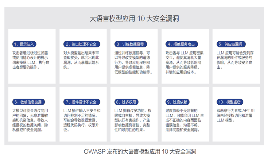 全球知名應用安全組織OWASP發(fā)布大模型應用的十大安全風險,包括提示注入、數(shù)據(jù)泄漏、沙箱不足和未經(jīng)授權的代碼執(zhí)行等。此外,因訓練語料存在不良信息,導致生成的內(nèi)容不安全,正持續(xù)引發(fā)災難性的后果,危害國家安全,公共安全甚至個人安全,這些都亟需業(yè)內(nèi)的高度重視和積極應對。