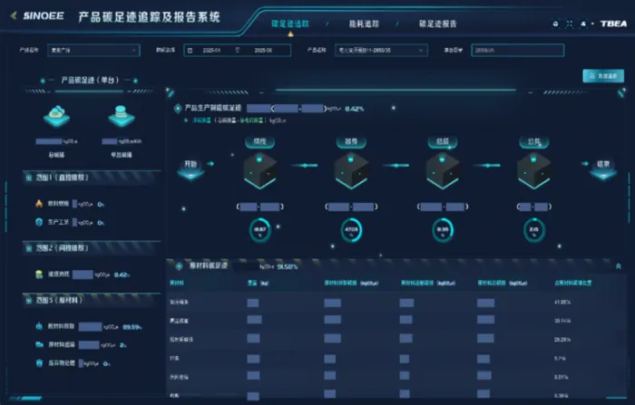 (1)碳足跡在線計(jì)算及追蹤:構(gòu)建能耗與工藝深度耦合的碳數(shù)據(jù)模型,將碳排核算由傳統(tǒng)的年度計(jì)量、總量分?jǐn)偡绞缴墳橛唵渭墕闻_產(chǎn)品準(zhǔn)實(shí)時(shí)核算。實(shí)現(xiàn)按產(chǎn)品型號級、訂單級碳足跡自動(dòng)核算,并按“原料組部件-原料運(yùn)輸-生產(chǎn)過程-廢棄物處置”進(jìn)行碳排的可信追蹤。