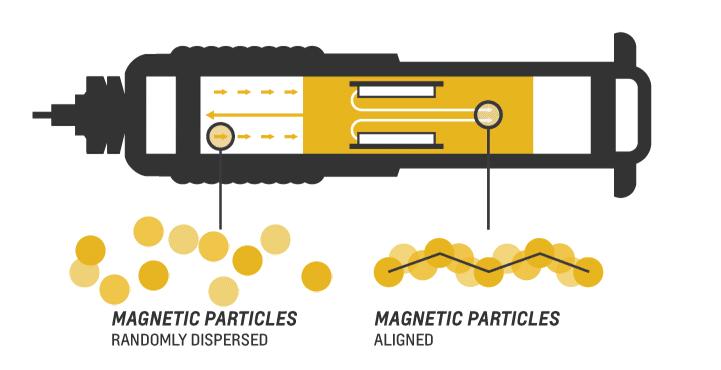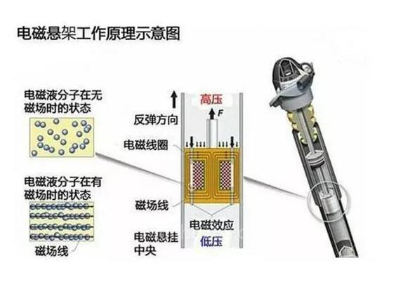 磁流變減振器內(nèi)部的油液是經(jīng)過磁化的,它可以通過電腦控制線圈產(chǎn)生磁性,使磁化后的減振油分子馬上垂直于壓力方向排列,從而改變阻尼系數(shù)來調(diào)整減振效果。